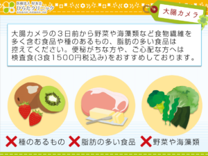 検査の1週間前ぐらいから、毎日排便がある様に排便コントロールをお願いします。